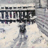 "As achromatic goes, these paintings are actually quite colorful! The surface is rich in layers of thick color and texture that pop through, enlivening the action of the paint and environment it represents. Each panel functions as a storyboard from a singular neighborhood snow event from my childhood that plays off each other as a triptych, but they are also wonderful individual narratives too and can be purchased separately. The color pops enhance the sense of livly discovery under the snow. Where I come from, a snow day like this might only last 24 hours before it melts away. It is a magical reminder of how fast the world changes and how fast we grow up. Do you remember a big snowfall from your early childhood? The excitement of the day? The newness of the world?