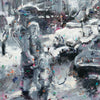 "As achromatic goes, these paintings are actually quite colorful! The surface is rich in layers of thick color and texture that pop through, enlivening the action of the paint and environment it represents. Each panel functions as a storyboard from a singular neighborhood snow event from my childhood that plays off each other as a triptych, but they are also wonderful individual narratives too and can be purchased separately. The color pops enhance the sense of livly discovery under the snow. Where I come from, a snow day like this might only last 24 hours before it melts away. It is a magical reminder of how fast the world changes and how fast we grow up. Do you remember a big snowfall from your early childhood? The excitement of the day? The newness of the world?
