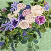 Soft blush roses unfurl at the heart of this composition, surrounded by lavender star-shaped blossoms, creamy peonies, and deep violet anemones. The palette moves effortlessly between powder pinks, lilacs, and fresh mint greens creating a harmony that feels both delicate and alive.